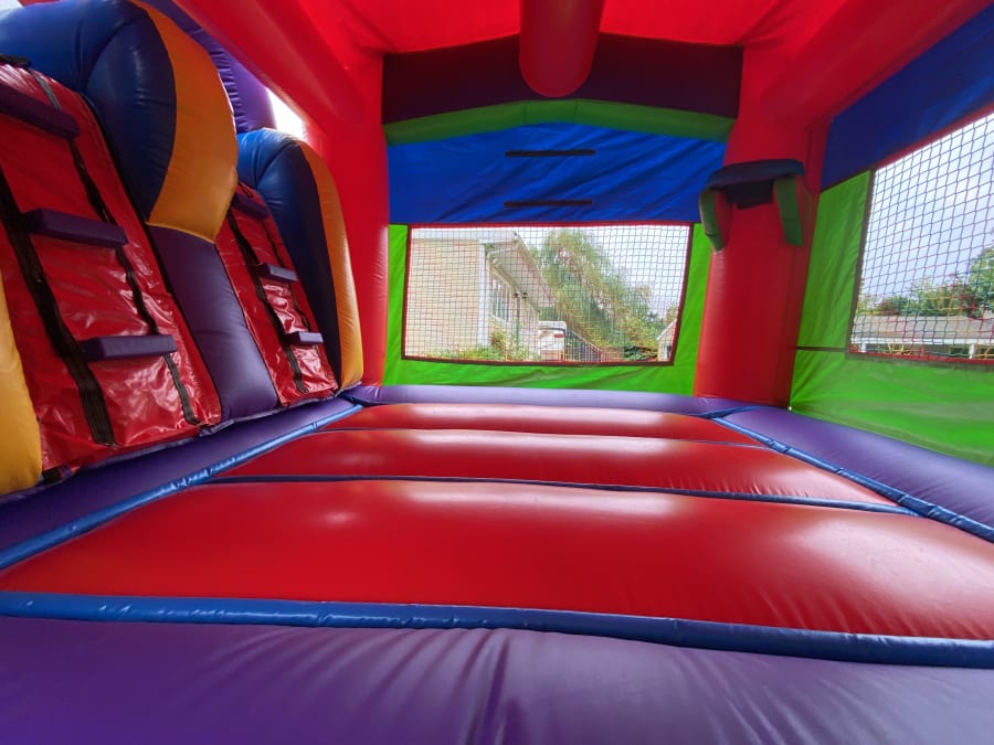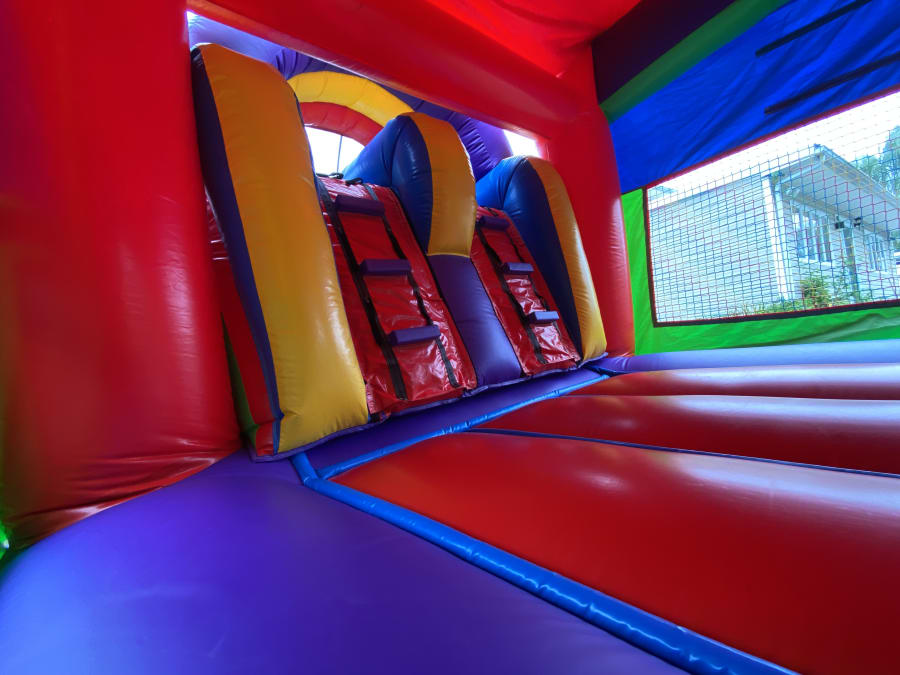 Our classic color themed 27ft Classic Dual Lane Combo is perfect for children 4 and up. This combo includes a bounce house, basketball hoop, climbing wall, and dual lane slide!