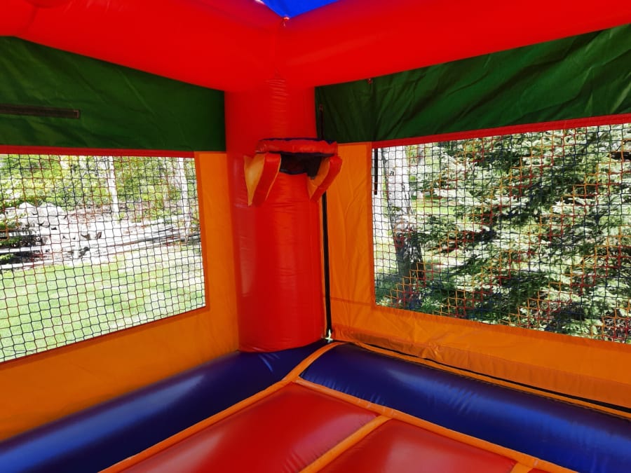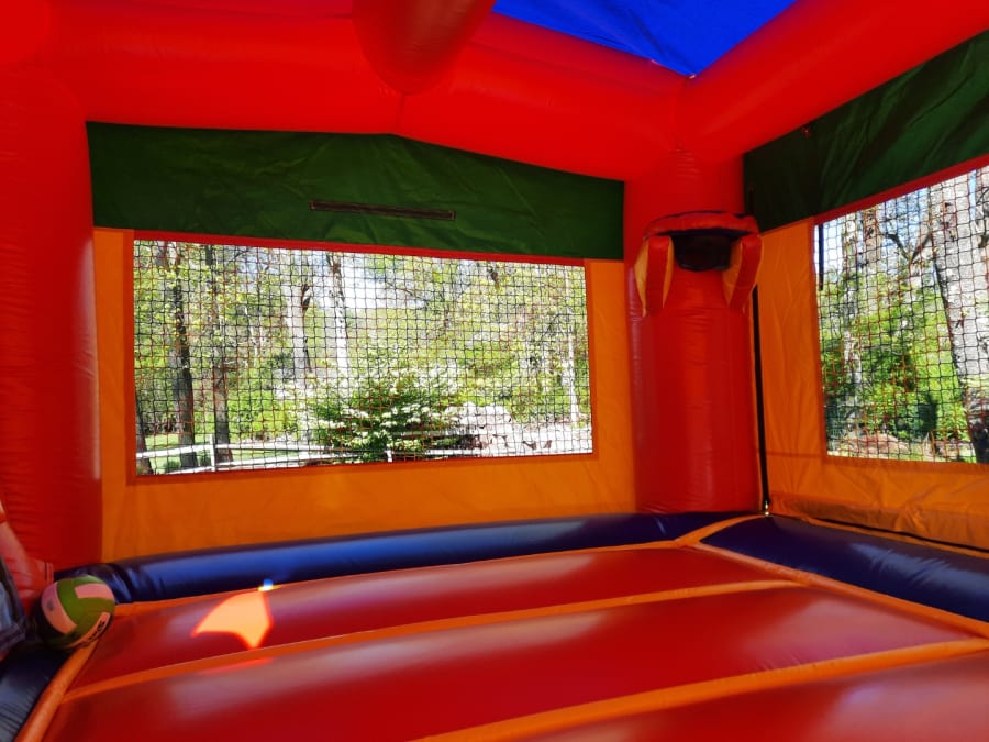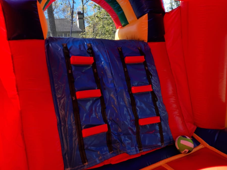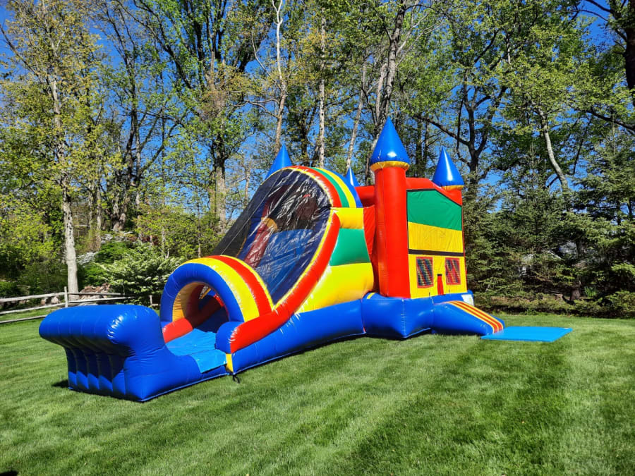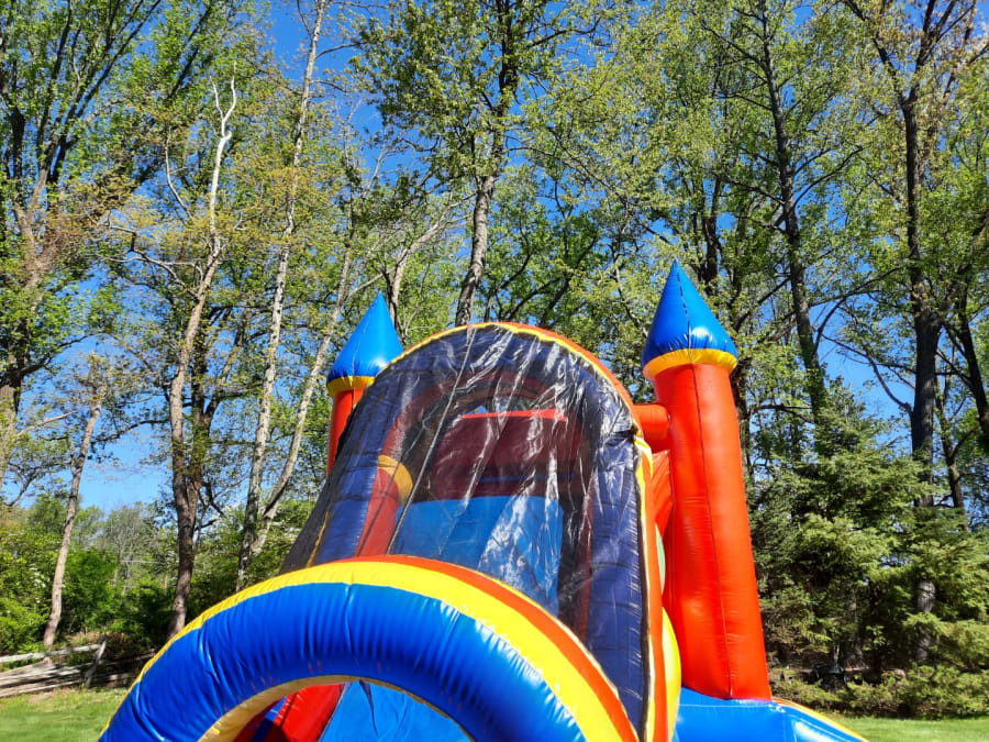Our 27ft Castle Single Lane Combo is perfect for children 4 and up. This combo includes a bounce house, basketball hoop, climbing wall, and single lane slide!