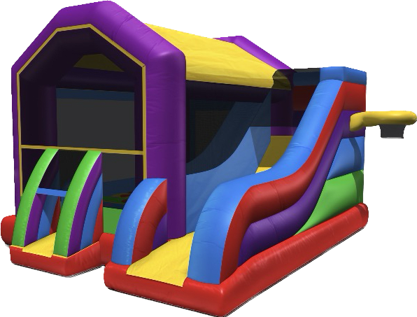 Combo has it all! This bounce house includes a bouncing area, interior basketball hoop, climbing wall, slide, and exterior hoop. Keep your guests bouncing and entertained at your next party!